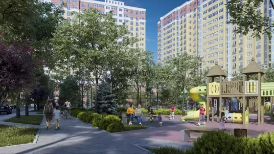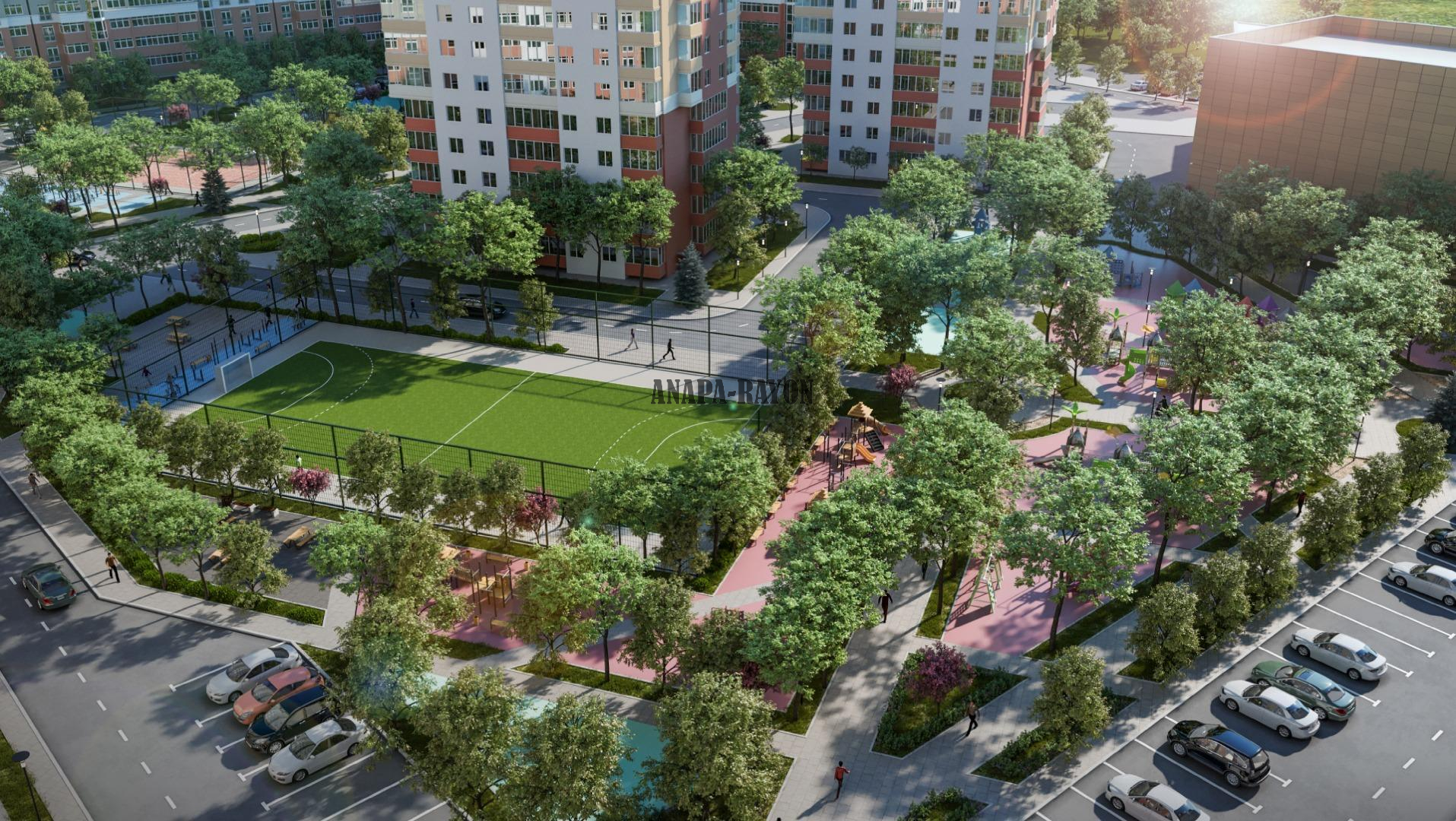 Комплекс строится на участке 6,4 гектара - это самый большой благоустроенный двор в Анапе, в котором будут построены: 3 игровые детские площадки, современное футбольное поле, баскетбольная площадка, спортивный комплекс с бассейном и автомойка, а также зона отдыха с комфортными скамейками. Земля в собственности у застройщика. На территории 1,6 а будут высажены декоративные растения, в том числе платаны.